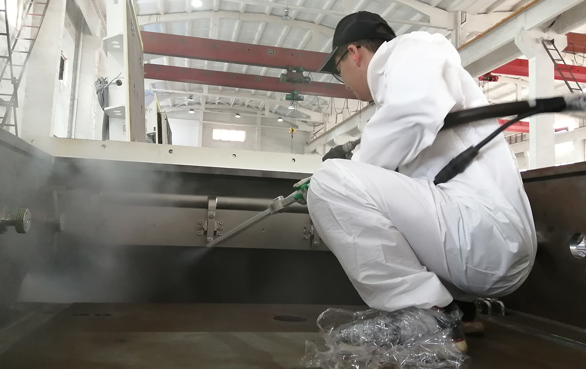 干冰清洗也是工業清洗的一種方式,只不過干冰清洗是通過空氣壓縮機將顆粒干冰噴射到需要清洗的物體上面,在利用干冰的低溫將污垢冷凍脆化,再通過高壓氣體將污垢沖洗干凈。